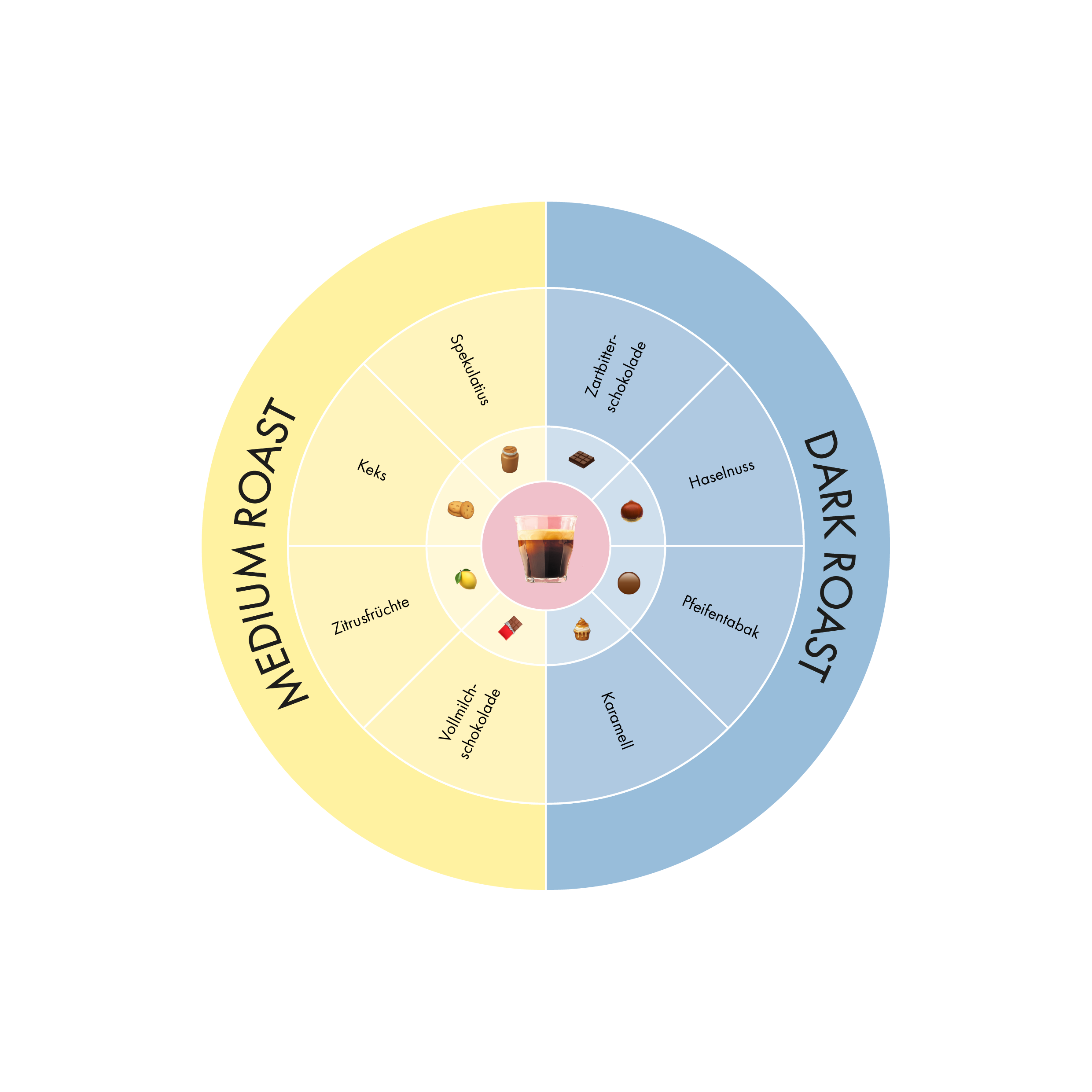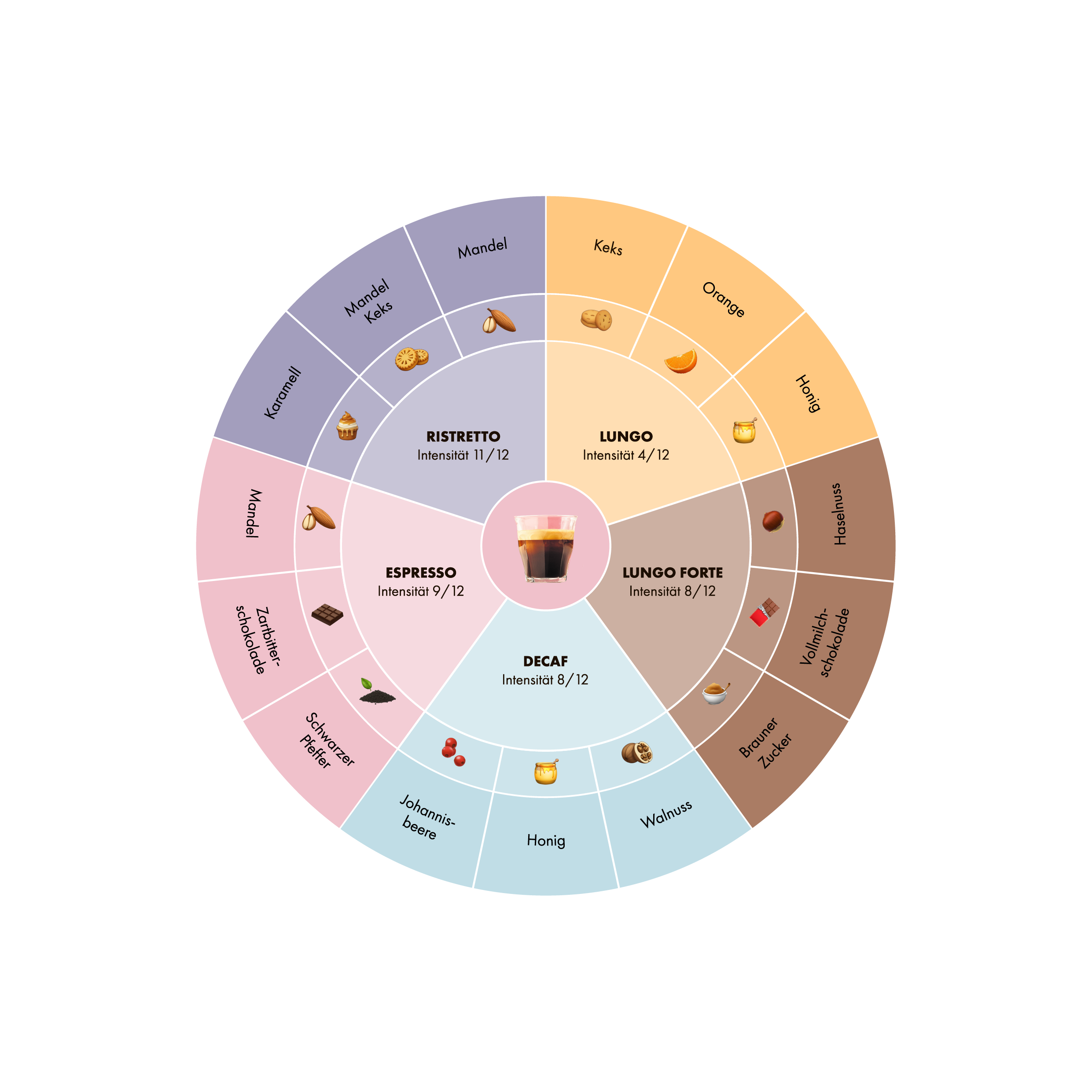 Keine Sorge, du musst kein Kaffee-Sommelier sein, um deine perfekte Tasse Kaffee zu finden. Wir haben bereits eine Auswahl für dich zusammengestellt. Erkunde das Aromarad und finde heraus, welche Sorten dir am meisten zusagen. Wie wäre es mit einem Lungo mit feinen Keks-, Honig- und Orangennoten? Oder bevorzugst du einen kräftigen Espresso mit Akzenten von Pfeffer, dunkler Schokolade und Mandeln? Welchen Geschmack du auch immer suchst, wir haben einen Kaffee, der zu dir passt.